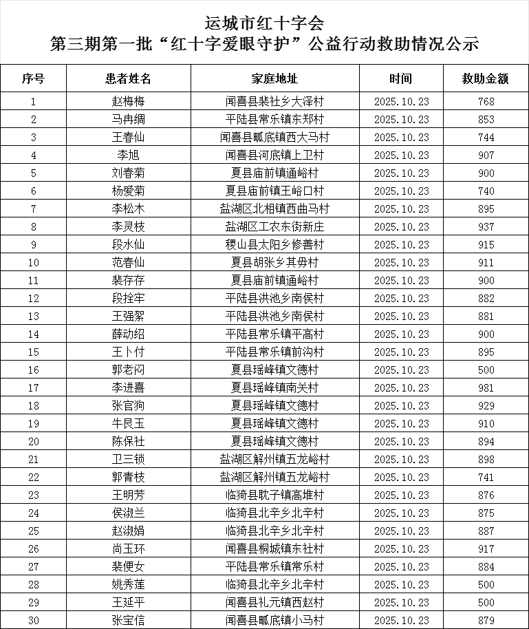 运城市红十字会第三期第一批“红十字爱眼守护”公益行动救助情况公示
